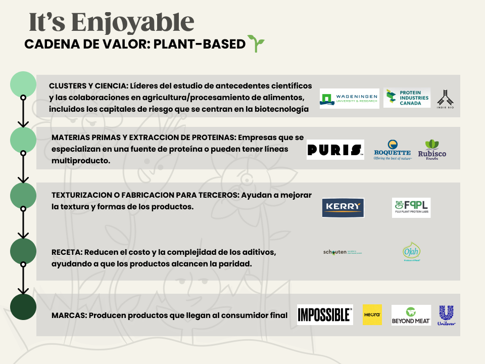El siguiente esquema es nuestra versión de la cadena de valor de proteínas alternativas de origen vegetal, que se obtiene a partir de nuestra propia comprensión del mercado y el informe de análisis de BCG.